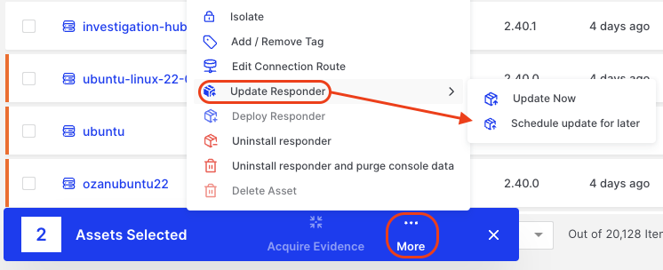You can also manually update Responders by selecting multiple assets. If any of the selected assets require a Responder update, the option to do so will be available to the user through the ‘More’ option in the Bulk Action bar.