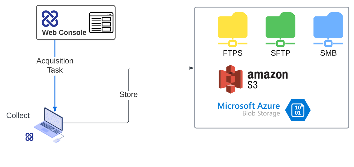 AIR provides two separate mechanisms for storing collected evidence, artifacts, and data. The first and default method is to use the local storage of the asset and the server machines’ file system. The second method utilizes remote network services, which we refer to as Evidence Repositories, including SFTP, FTPS, SMB, Amazon S3 Buckets, Azure Blob Storage, and Google Cloud Storage.