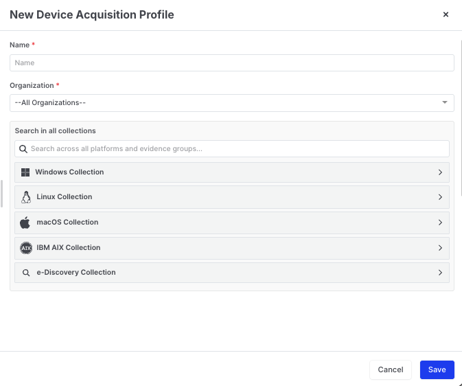 * **Device Acquisition Profiles**: Used to collect evidence and artifacts from Windows, Linux, macOS, and IBM AIX machines—either via an installed Responder on networked assets, or using a portable Responder executed from external media (such as a USB drive) for off-network collections.