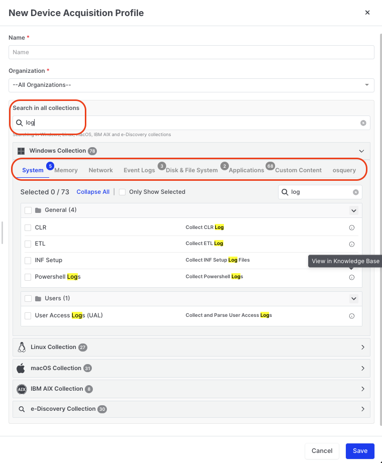 With hundreds of evidence types available across multiple operating systems, finding specific collectors can be time-consuming. The **Search in all collections** feature enables you to instantly locate relevant collectors by keyword.