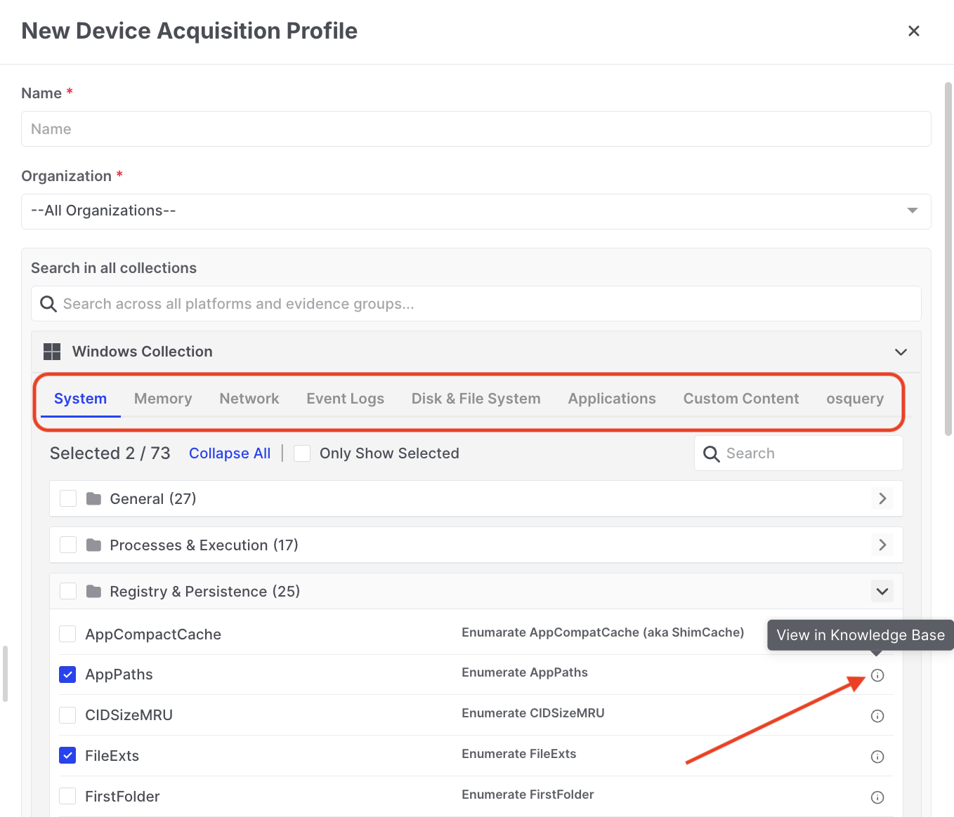 * Building targeted profiles for specific artifact types (e.g., searching "log" to find all log-related collectors).