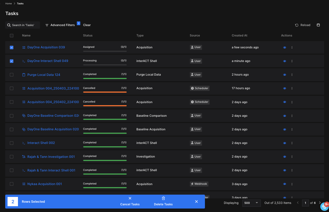 For each task, detailed information such as task type (e.g., acquisition, triage, timeline generation), status, and associated endpoints is available, allowing for granular tracking and auditability.