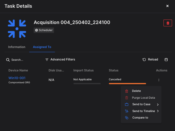 The **Assigned To** tab provides information about the assets to which the task has been assigned. For each asset, an **Actions** menu is available, enabling investigators to: