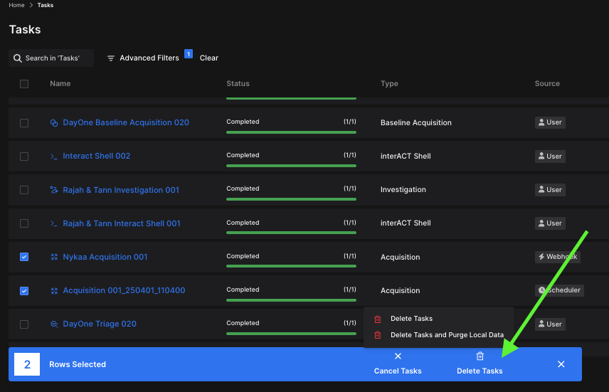 In addition to cancellation, users can now delete multiple tasks in one action. When selecting the **Delete Tasks** option from the bulk action bar, two deletion modes are available: