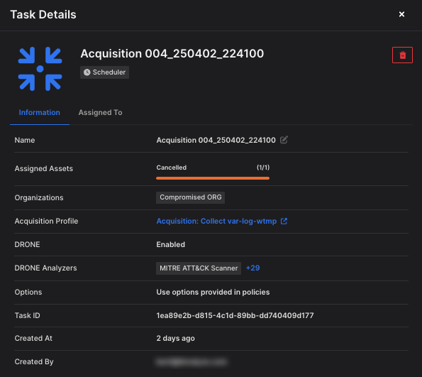 In the **Task Details** window, there are two tabs: **Information** and **Assigned To**. The **Information** tab displays details such as the creator of the task, the policy applied, the DRONE analyzers used, and the selected acquisition profile.