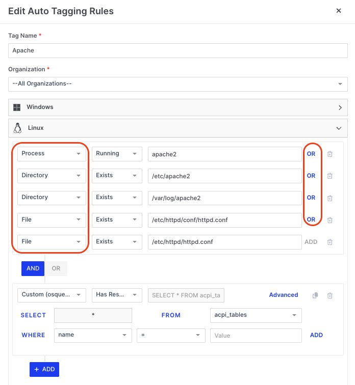 When we examine the Auto Tag conditions set for tagging an Apache Server, we can see that the AIR Responder will evaluate five conditions, all of which are independent of each other, as the OR switch is active. So, if any one of these conditions exists, the Apache Tag will be applied to the asset: