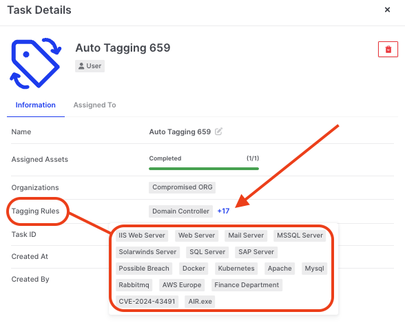 Any Auto Tags used in a Tasking Assignment are displayed under the Information tab in the Task Details window. In the example below, we can see that the Tagging Rule for Domain Controller has been run along with 17 others that are related by clicking on the ‘**+17**’ link: