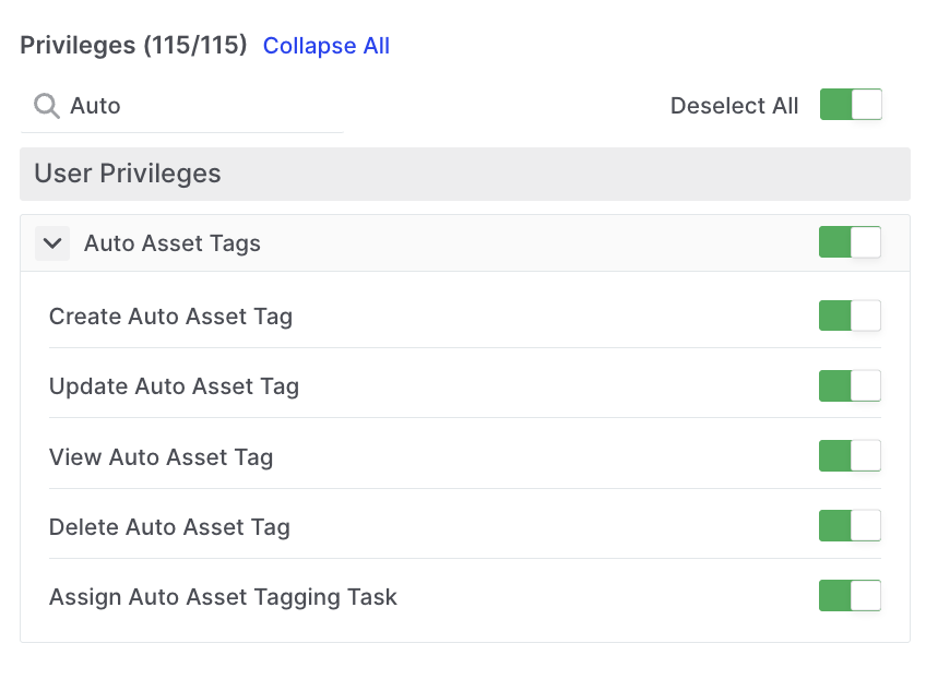 AIR has very granular permission control over Users and Roles, and within Roles, there are currently over 114 individually configurable privileges. Six of these allow Global Administrators to determine what users can do within the Auto Asset Tagging feature: