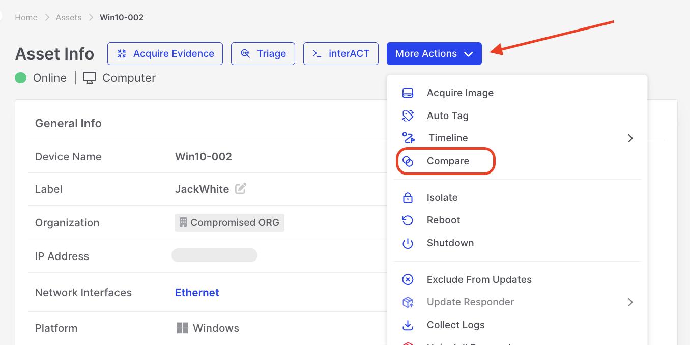 - Navigate to ‘Compare’ under Asset Actions.