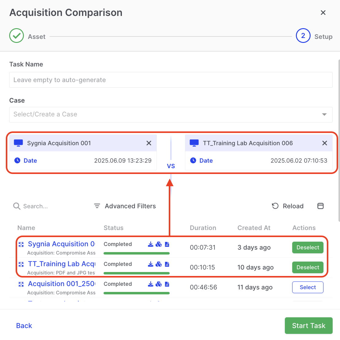 Section titled “Baseline analysis with Compare”The Compare feature enables proactive forensics through baseline analysis, allowing investigators to focus on forensic evidence from the earliest stages of an investigation. Using a patent-pending approach, it identifies and highlights forensic artifacts—added, modified, or deleted—between asset snapshots.