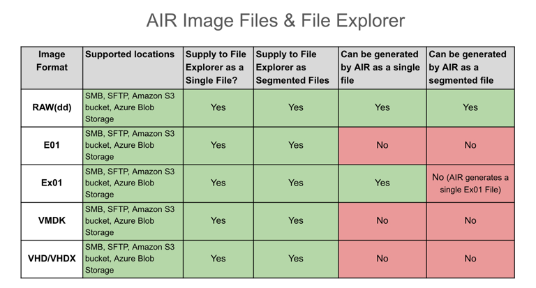 The image must be supplied to AIR from your **SMB, SFTP, Amazon S3 bucket, Azure Blob storage, or Google Cloud Storage** evidence repositories; segmented files are supported.