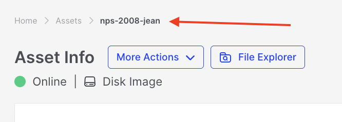 Navigating to the root of the Device Name in the breadcrumb path opens the Asset Info page for the mounted disk image: