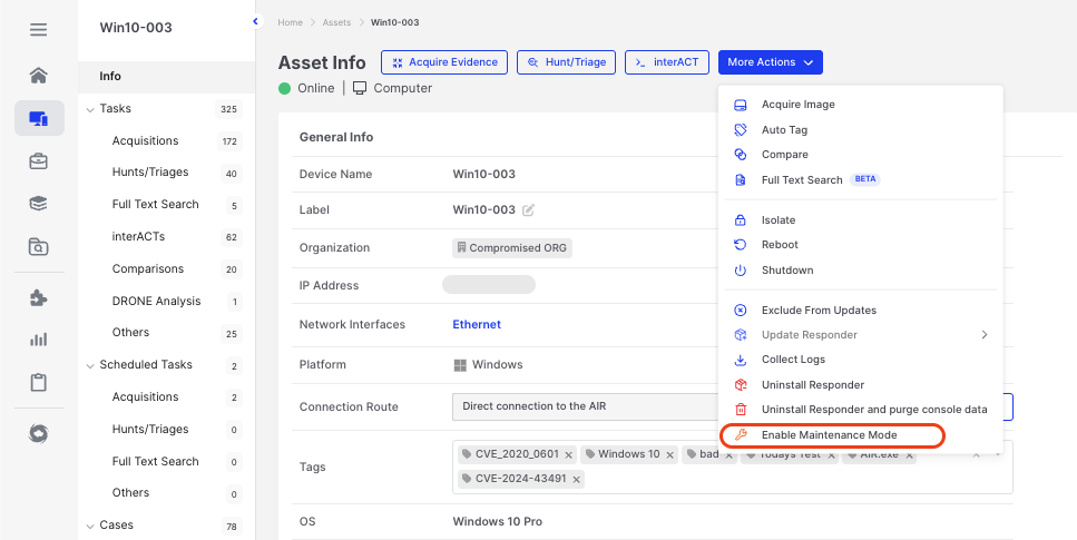 When working with cloned or duplicated asset instances, Maintenance Mode prevents conflicting task assignments. This helps analysts maintain chain-of-custody and ensures collected information remains contextually accurate.