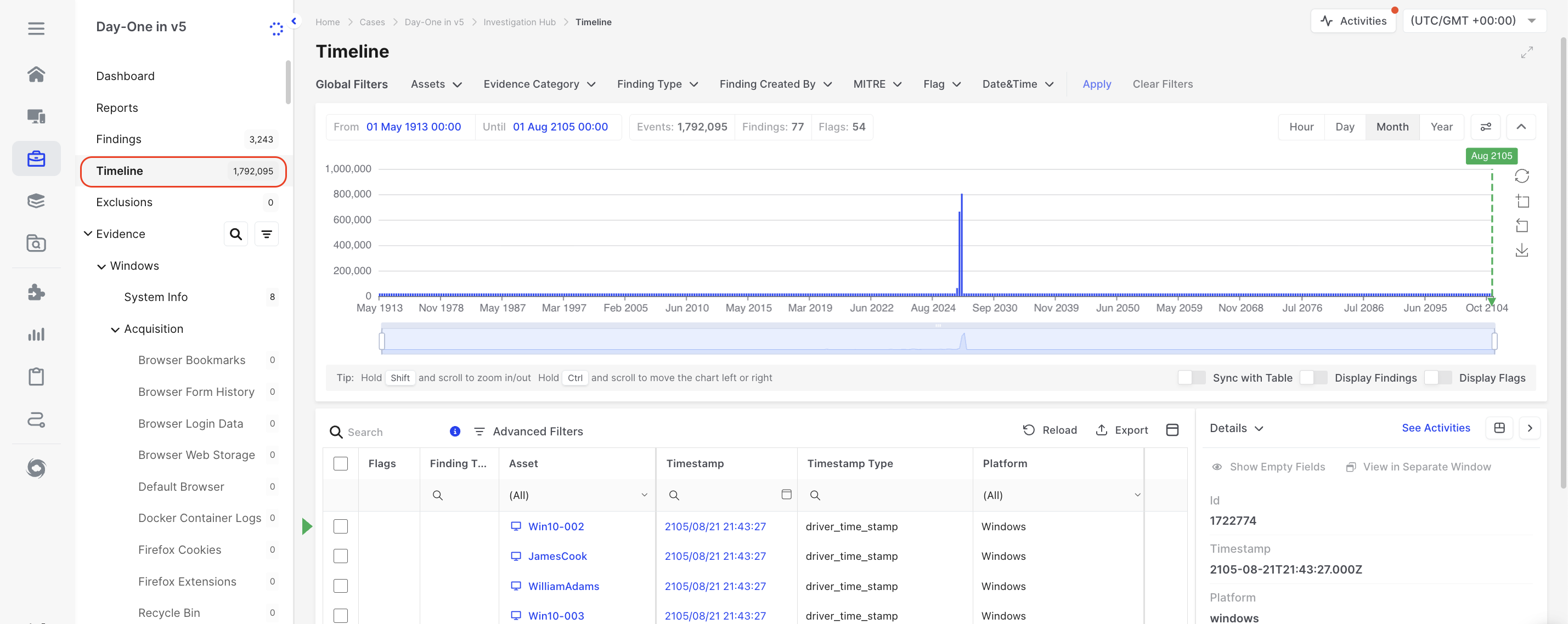 1. **Global filters** (e.g., Assets, Evidence Category, Finding Type) apply to the entire Investigation Hub, including the Timelin&#x65;**.**