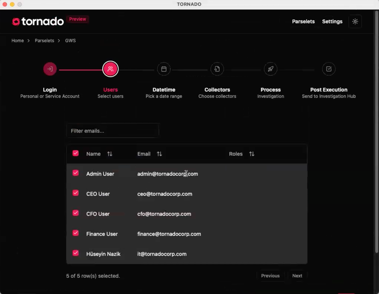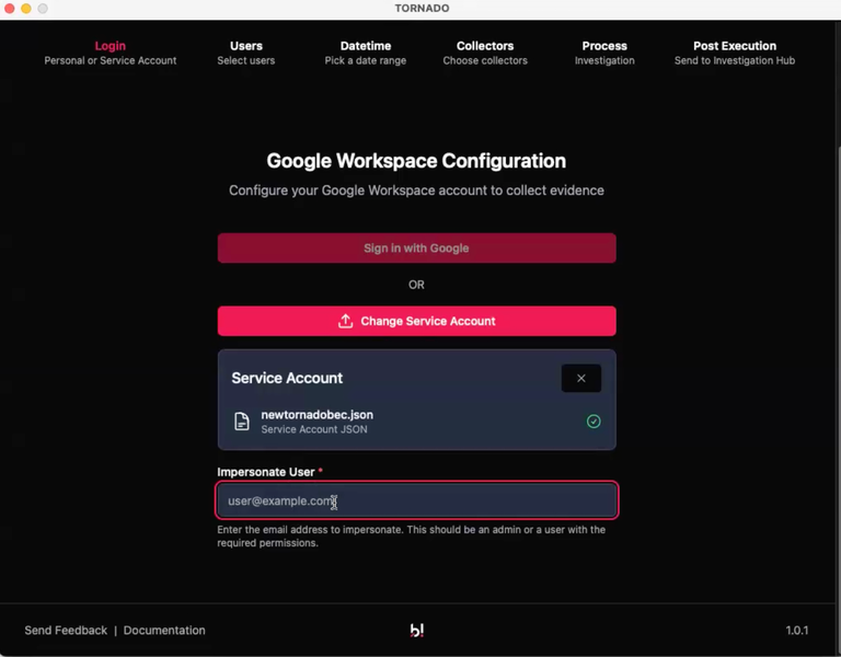 To use the Service Account Tornado users are required to set up some GWS Collector Prerequisites, and this is explained here: [**Service Account Creation**](https://kb.binalyze.com/air/features/tornado-preview-version/tornado-collectors/accessing-google-workspace/service-account-creation)