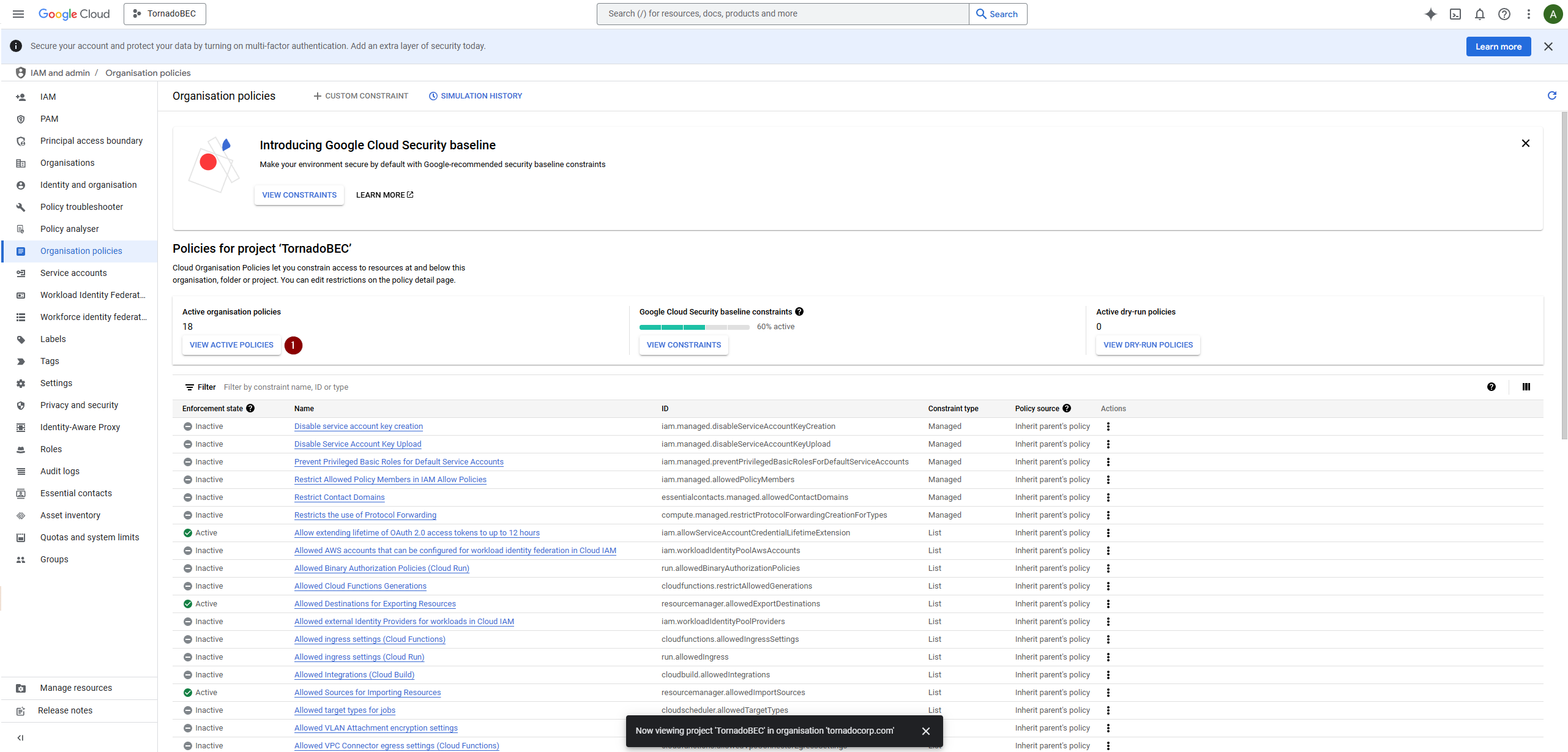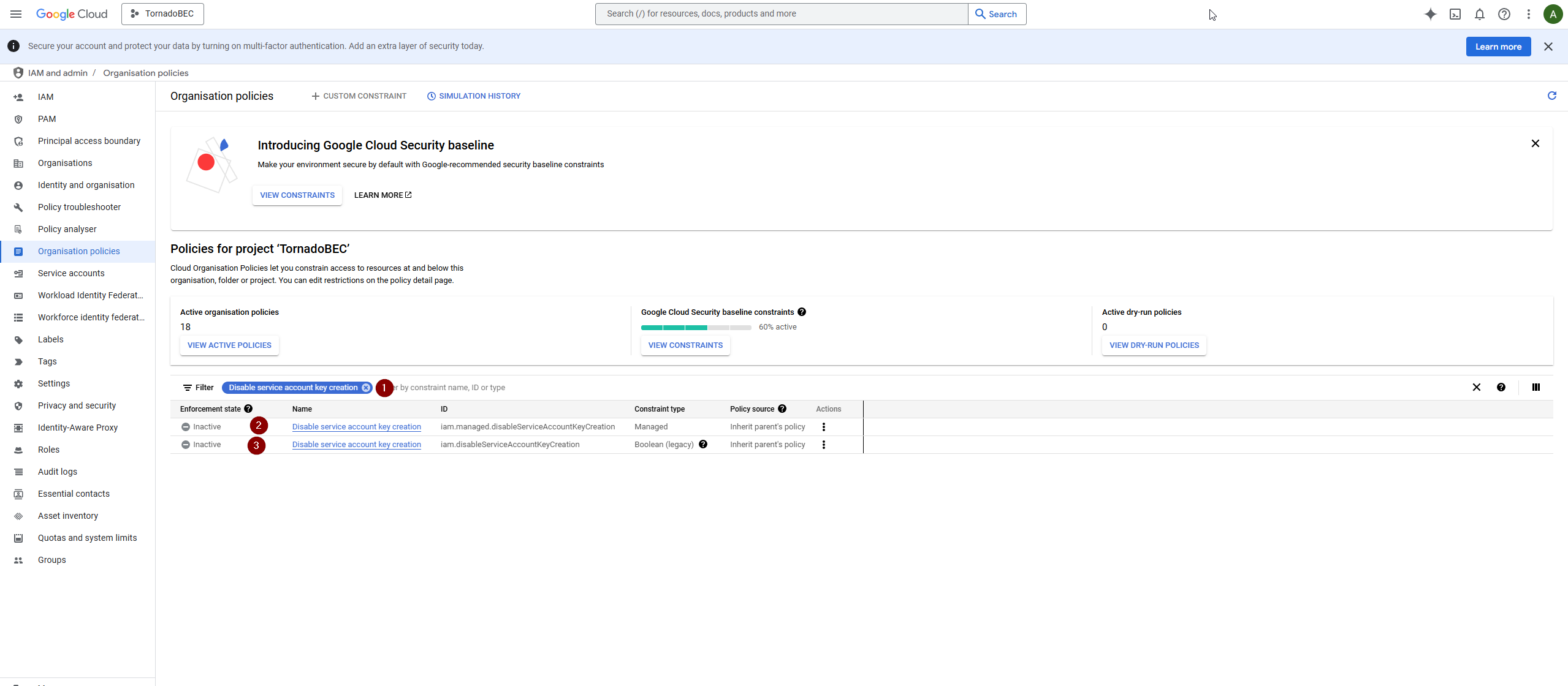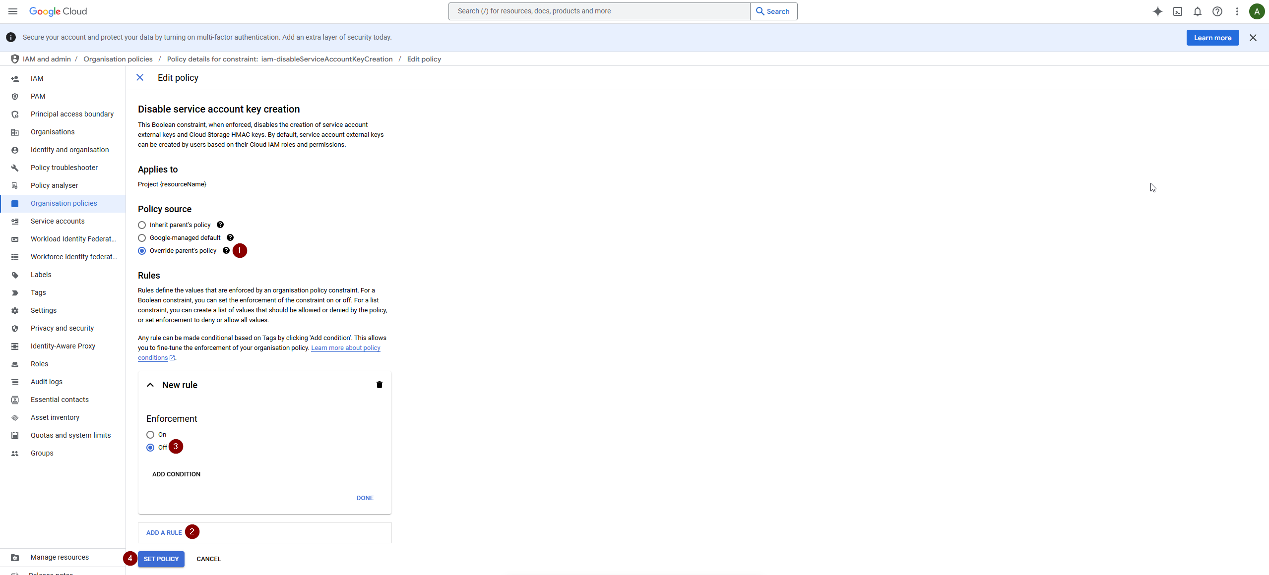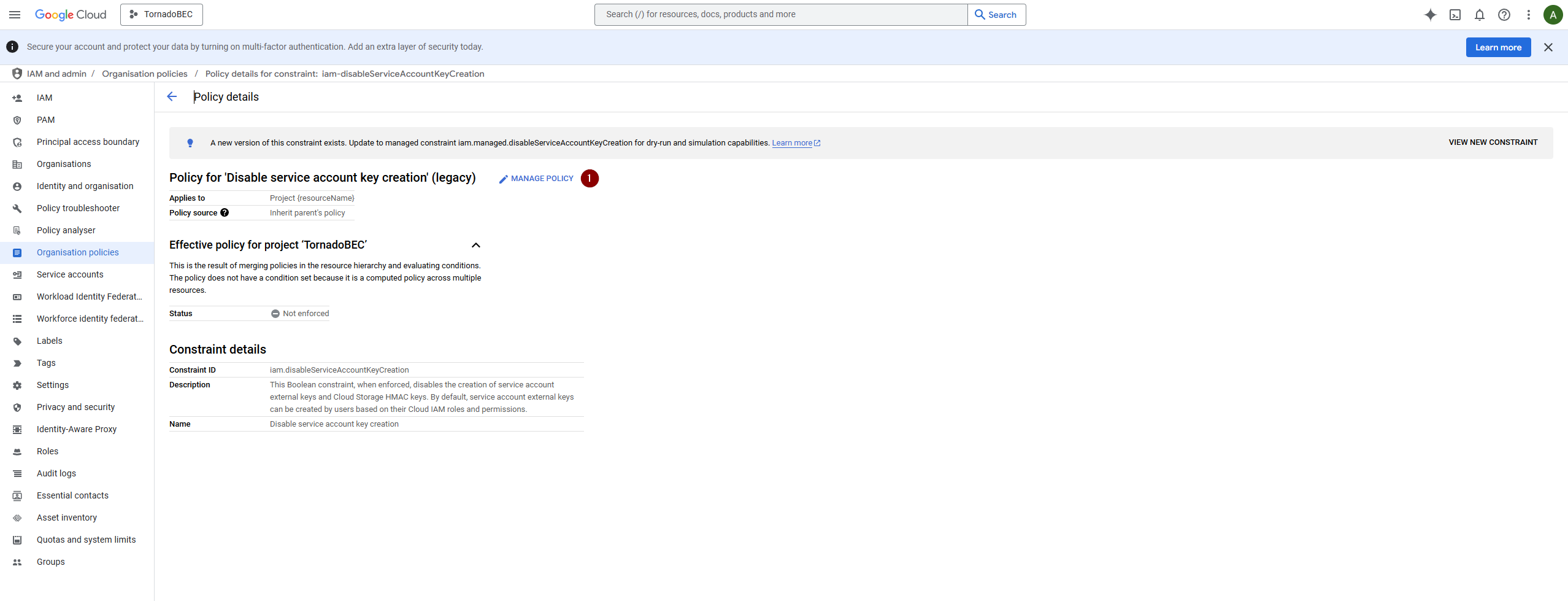 View active policies and look for the policy that disables service account key creation. Select the policy to manage it.