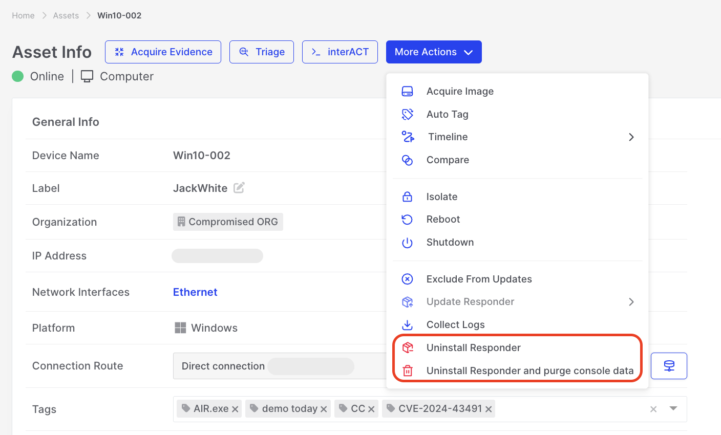 It is also possible to uninstall a Responder from the individual asset’s, Asset Info page by selecting the option from the Asset Actions drop-down menu: