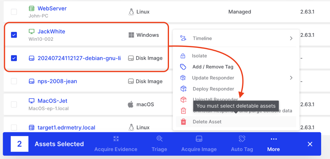 As shown above, when attempting to delete assets in the system, certain restrictions apply based on the type of assets selected. For instance, if you select both a Windows asset and a Disk Image asset simultaneously, the “Delete Asset” option becomes unavailable (greyed out). This is because the Windows Asset is classified as non-deletable.