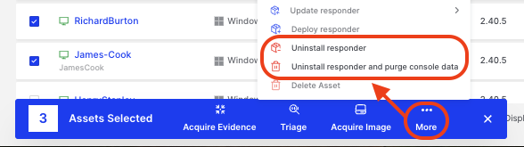 From the Assets button in the Main Menu it is possible to select one or multiple assets and then, via the Bulk Action Bar, choose to either ‘Uninstall a Responder’ or to ‘Uninstall responder and purge console data’.