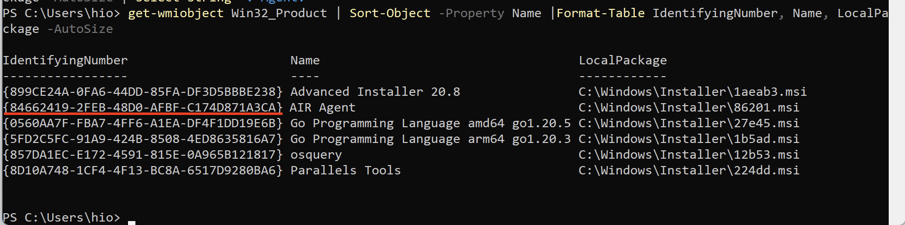 msiexec /x "C:\Users\hio\Downloads\AIR.Agent_2.25.0_air-dev.binalyze.com_44_4ce0820f14f6461a_amd64_.msi"