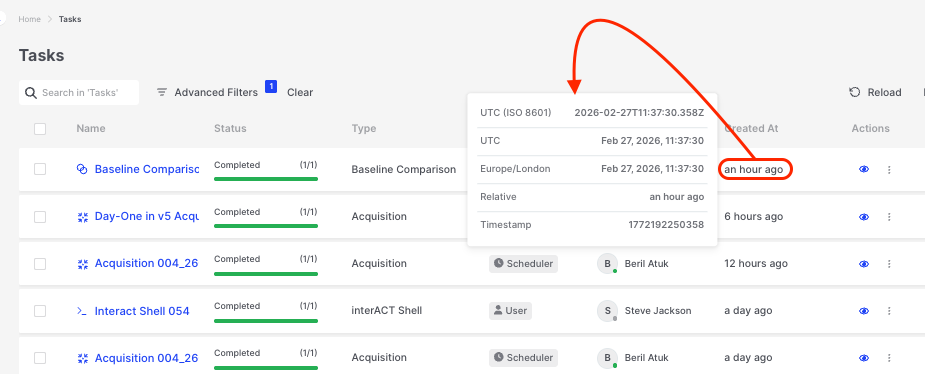 Throughout the Console (e.g. Evidence Repositories, Tasks, Cases, Assets, Acquisition Profiles, API Tokens), you can hover over any timestamp in a table to see a pop-over with that time in multiple formats—UTC (ISO 8601), UTC, local timezone, relative (e.g. “an hour ago”), and epoch. You can copy any format for reports or external tools; copying creates an event record for audit.