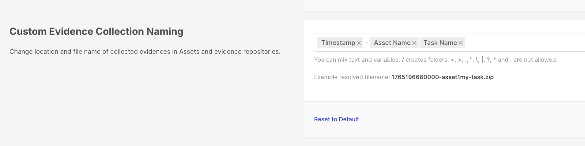 <figure><img src="https://1662683669-files.gitbook.io/~/files/v0/b/gitbook-x-prod.appspot.com/o/spaces%2FnA8kGzryHKp7UhDaLtzW%2Fuploads%2Fgit-blob-a6a6696672fbf905c6e2f23141423b9957b65a96%2Fevidence_repositories_custom_evidence_collection_naming.png?alt=media" alt=""><figcaption><p>Evidence Repositories: Custom Evidence Collection Naming</p></figcaption></figure>