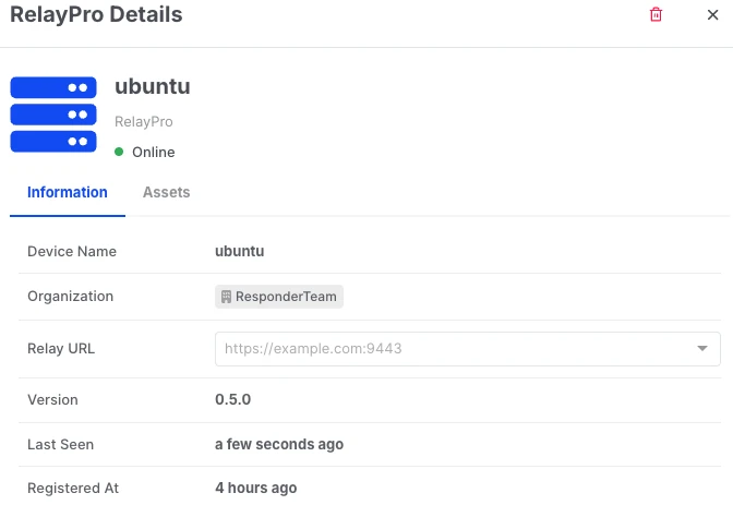 Section titled “Registration and Status”After installation and service start, RelayPro registers with the AIR console. On success, it updates /opt/binalyze/air/relaypro/config.yml with: