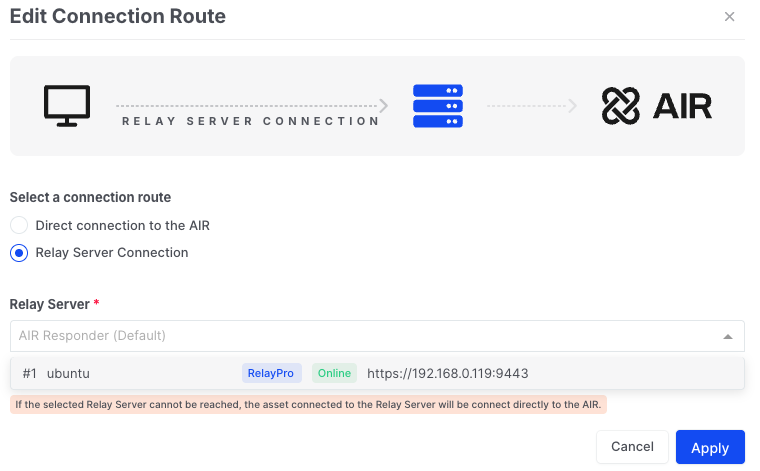 Section titled “Assign Responders and Connection Route”When a RelayPro is registered and its Relay URL is set, it becomes available in Connection Route settings.