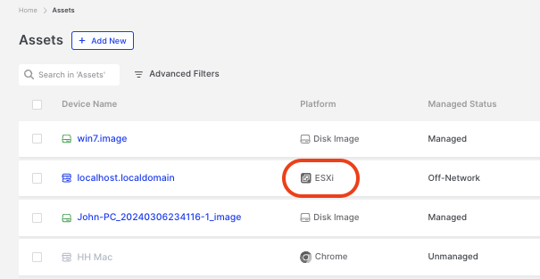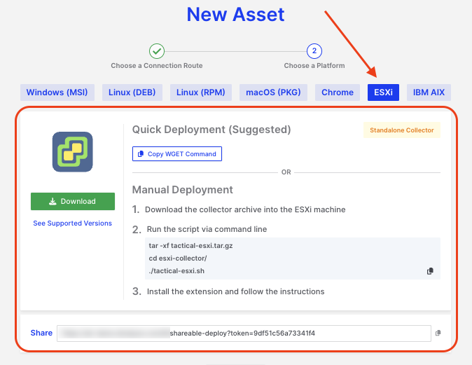 ESXi Standalone Collector: ESXi platform is shown on the AIR Asset page